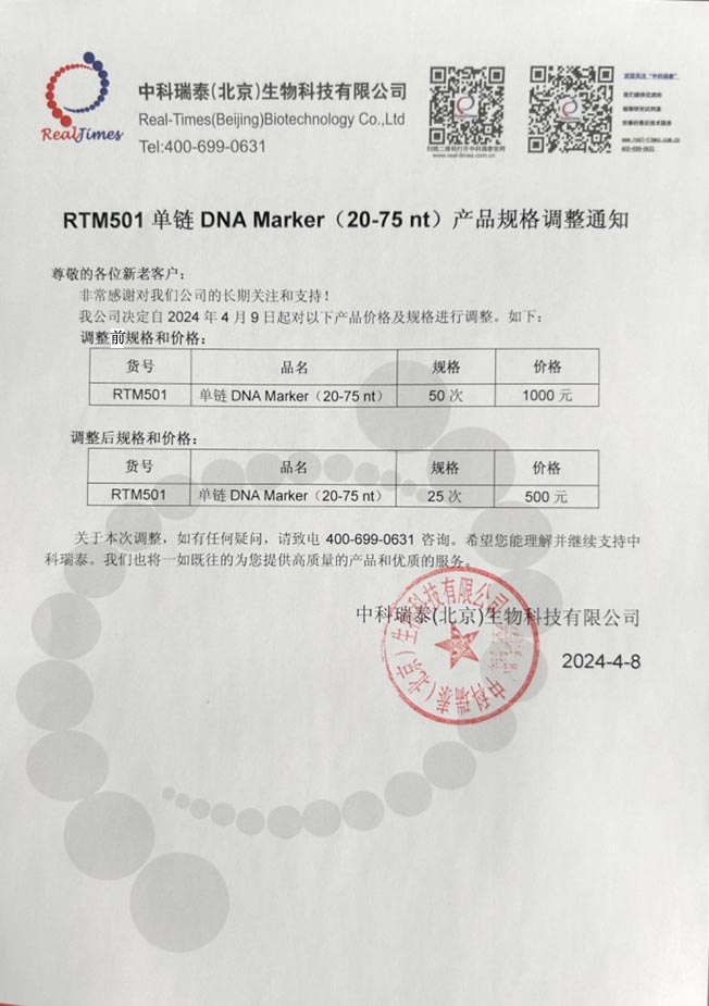 RTM501單鏈DNA Marker(20-75 nt)產品規格調整通知