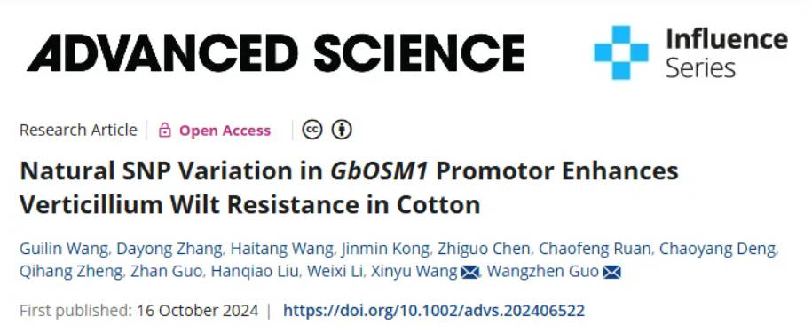 2024年10月16日,南京農(nóng)業(yè)大學(xué)郭旺珍及王心宇共同通訊在Advanced Science 在線發(fā)表題為“Natural SNP Variation in GbOSM1 Promotor Enhances Verticillium Wilt Resistance in Cotton”的研究論文。王桂林為論文第一作者。