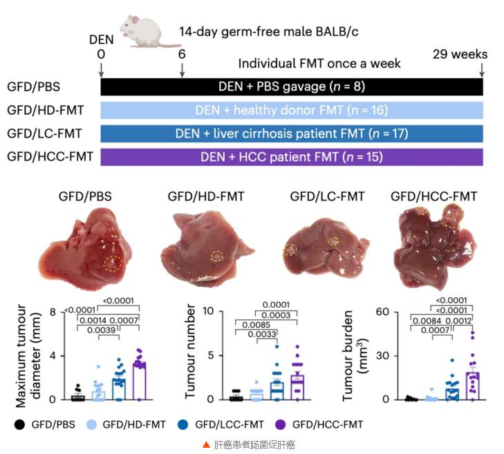 三組受試者糞便的測序結果顯示,肝癌患者糞便中微生物多樣性最低,但肺炎克雷伯菌卻高度富集。在移植后的小鼠腸道中,非常好的再現了不同受試者的腸道微生物特征。此外,基于無菌小鼠的誘導肝癌小鼠模型(GFD)表明,移植肝癌患者腸菌(HCC-FMT)的小鼠腫瘤直徑最大、數量最多、負擔最重。