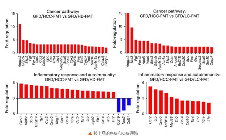 此外,移植肝癌患者的腸菌還會上調涉及細胞增殖、血管生成、胚胎發育、上皮間質轉化和抗凋亡相關的基因,以及促炎癥反應和淋巴細胞趨化相關基因表達也增加。