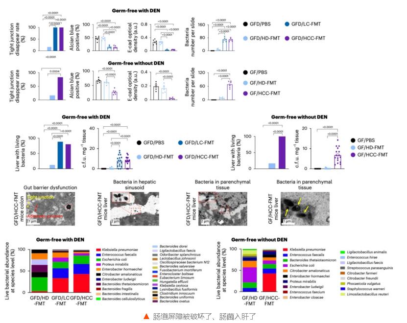 很顯然,腸道屏障受損肯定是關鍵。分析結果顯示,無論有沒有(GFD/GF)致癌物處理,移植肝癌患者腸菌的小鼠腸道通透性都會增加。電鏡觀察結果顯示,小鼠結腸細胞間連接異常——緊密連接消失、粘連增寬。此外,結腸粘液的厚度下降,緊密連接標志物下調,細菌更多地滲入粘膜固有層和粘膜肌層。