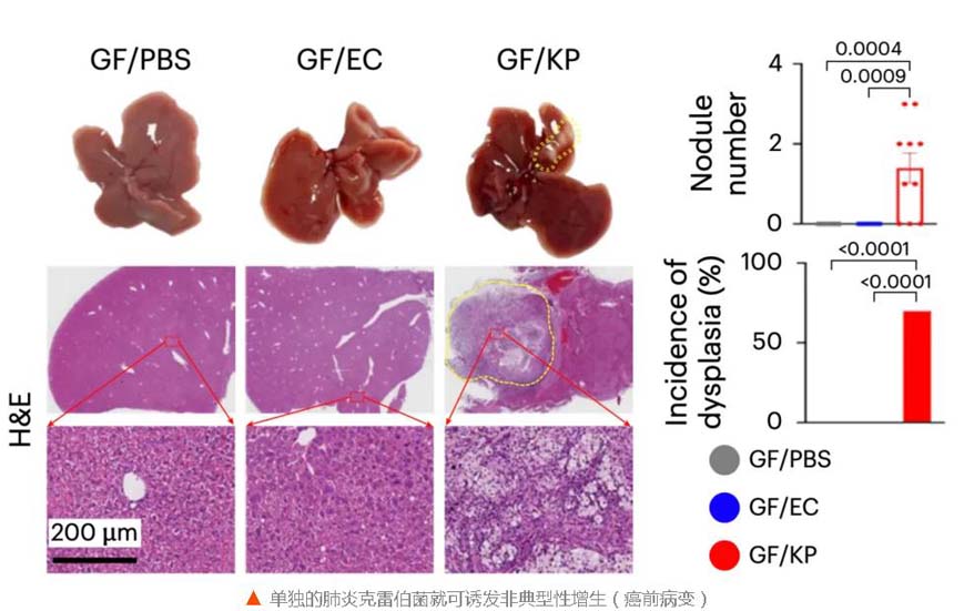 為了驗證肺炎克雷伯菌能否導致肝癌,于君團隊用肺炎克雷伯菌給無菌小鼠灌胃36周(不使用致癌劑),并以大腸桿菌和PBS灌胃作為對照。她們發現,只有肺炎克雷伯菌能誘導肝細胞增殖、纖維化損傷、致癌/促炎信號傳導,以及出現非典型性增生(癌前病變)。