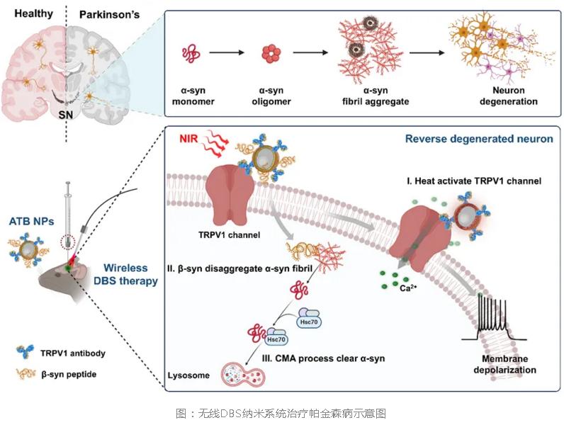基于此,研究團隊設計了一種光熱無線DBS納米系統,命名為ATB NPs。這一系統通過直接刺激神經元內源性表達的熱敏TRPV1受體,實現對退化神經元的精準調控。該系統由三個核心模塊組成:光熱轉換模塊(金納米殼AuNSs),用于激活熱敏TRPV1離子通道;靶向模塊(TRPV1抗體),靶向高表達TRPV1受體的多巴胺能神經元;降解模塊(β-syn多肽,含近紅外響應連接體),通過結合α-syn的非淀粉樣蛋白-β成分疏水結構域,降解α-syn纖維。通過立體定位技術將ATB NPs注射至PD小鼠的黑質后,ATB NPs借助TRPV1抗體錨定在多巴胺能神經元表面。在808 nm脈沖近紅外激光照射下,ATB NPs作為納米天線進行光熱轉換,激活熱敏TRPV1受體,引起Ca2+內流和動作電位產生。同時,ATB NPs釋放β-syn多肽,并通過激活分子伴侶介導的自噬途徑,清除α-syn聚集體,從而減少病理性纖維。最終,ATB NPs恢復了多巴胺能神經元的交互網絡及多巴胺釋放能力,改善PD小鼠的運動功能。該無線DBS納米系統的優勢主要包括:利用黑質多巴胺能神經元內源性表達的TRPV1受體,無需植入神經電極或進行基因操作;結合近紅外激光技術,能夠對特定腦區的退行性神經元實現精準的時空調控;無線DBS納米系統具有良好的生物安全性。這種基于納米顆粒的無線DBS治療策略為帕金森病及其他神經退行性疾病的治療提供了新思路。