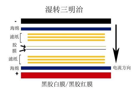3.3 三明治結構:轉膜三明治結構與傳統轉膜相同,即根據“黑膠白膜”制作三明治,即膜置于轉膜夾芯正極一側,凝膠置于轉膜夾芯負極一側,這樣凝膠上帶負電荷的蛋白才能轉移到膜上。