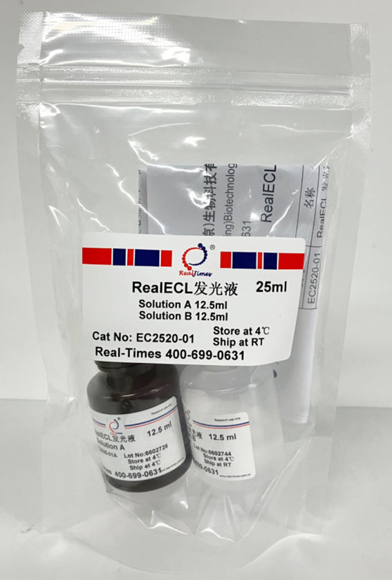 RealECL 是一種超敏ECL化學(xué)發(fā)光試劑盒,可與二抗上耦連的辣根過氧化物酶(HRP)發(fā)生化學(xué)反應(yīng),發(fā)出熒光,從而可以通過用X光片壓片或其它適當(dāng)熒光成像設(shè)備檢測樣品。RealECL具有極高靈敏度和高信噪比,可檢測出10-100 fg的微量抗原;發(fā)光迅速,熒光可使X感光膠片感光達(dá)1小時以上,特別適用于痕量蛋白檢測;另外高靈敏度可以大大節(jié)省寶貴的樣品以及非常昂貴的一抗和二抗的用量,降低實(shí)驗(yàn)成本。