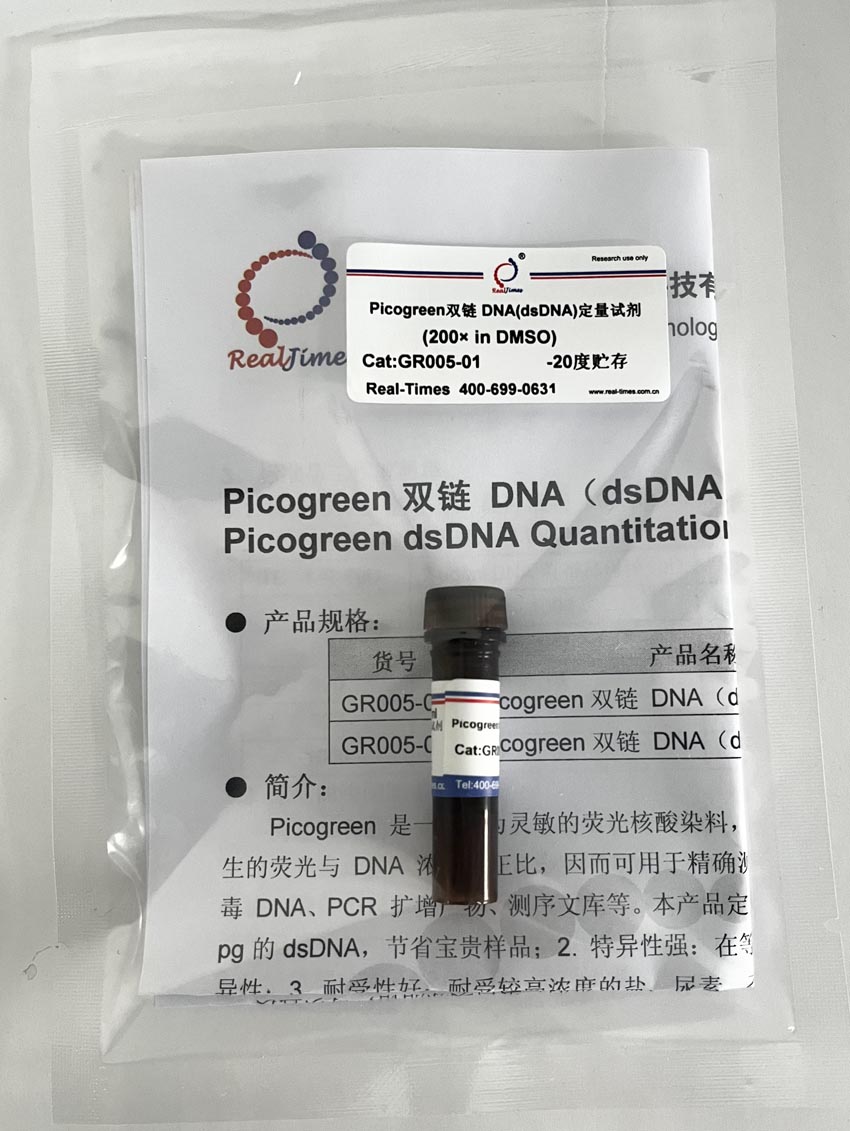 Picogreen 是一種極為靈敏的熒光核酸染料,其僅在與DNA 雙鏈結合后才發出熒光,且所產生的熒光與 DNA 濃度呈正比,因而可用于精確測量多個來源的 dsDNA,包括基因組 DNA、病毒 DNA、PCR 擴增產物、測序文庫等。本產品定量具有以下優勢:1. 靈敏度高:可檢測低至200 pg的dsDNA,節省寶貴樣品;2. 特異性強:在等摩爾的RNA存在的條件下,對dsDNA具有特異性;3. 耐受性好:耐受較高濃度的鹽、尿素、乙醇、氯仿、去垢劑、蛋白或瓊脂糖,可以直接定量PCR擴增產物而無需從反應混合物中純化DNA。4. 易于使用-只需在樣品中加入染料,等待5分鐘,然后讀數即可,且適用于96和384孔板;與大多數基于熒光的酶標儀和熒光計兼容。5. 適用范圍廣:可適用于PCR的分析、芯片樣品、DNA損傷分析、酶活分析、基因組DNA定量以及復雜混合物中dsDNA的檢測和病毒DNA定量等多種領域。