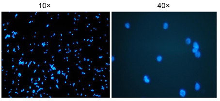 操作流程: Jurkat細胞,計數1×106/ml;500 g 3 min收集2 ml 細胞;細胞沉淀中加入1 ml卡諾固定液,常溫固定10 min;1×PBS漂洗兩次;細胞沉淀中加入200 μl Hoechst 33342即用型染色液(10 μg/ml);37度避光染色10 min; 離心后細胞沉淀重懸于100 μl 1×PBS中;取5 μl細胞懸液滴于載玻片上,加5 μl 抗熒光淬滅劑,封片觀察。