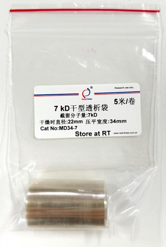 透析膜可用動物膜和玻璃紙等,但用的最多的還是用纖維素制成的透析膜,目前常用的是美國Union Carbide (聯合碳化物公司)和美國光譜醫學公司生產的各種尺寸的透析管,截留分子量MWCO(即留在透析袋內的生物大分子的最小分子量)。截留分子量越大也就是說透過性越大。