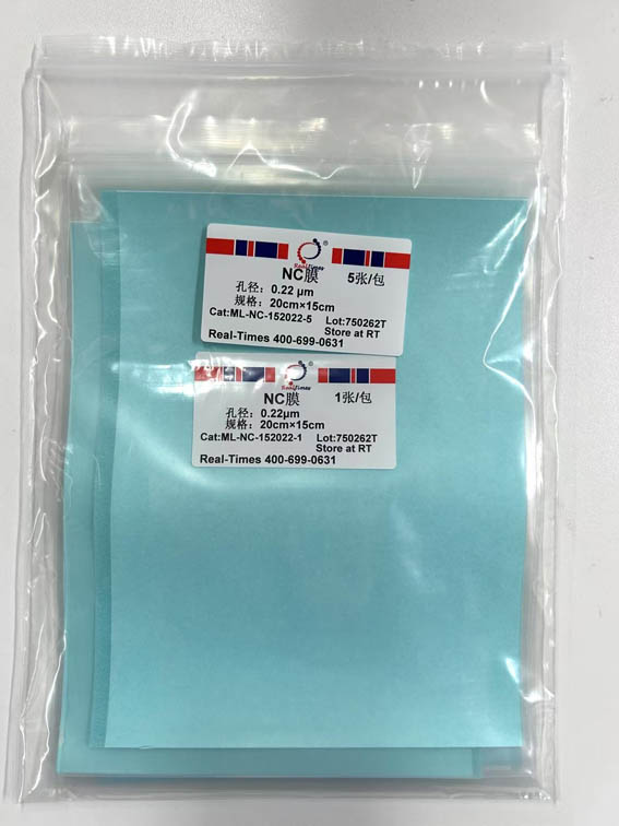 硝酸纖維素膜(Nitrocellulose membrane,NC膜)是蛋白印跡最廣泛使用的轉移介質,對蛋白有很強的結合能力,而且適用于各種顯色方法。具有使用方便,易保存(結合有蛋白的NC膜4℃可保存幾年)等優點。NC膜分為0.45μm,0.2μm,0.1μm三種。分子量小于20kD蛋白使用0.2μm,分子量小于7kD蛋白使用0.1μm。本公司產品為孔徑0.22μm NC膜。