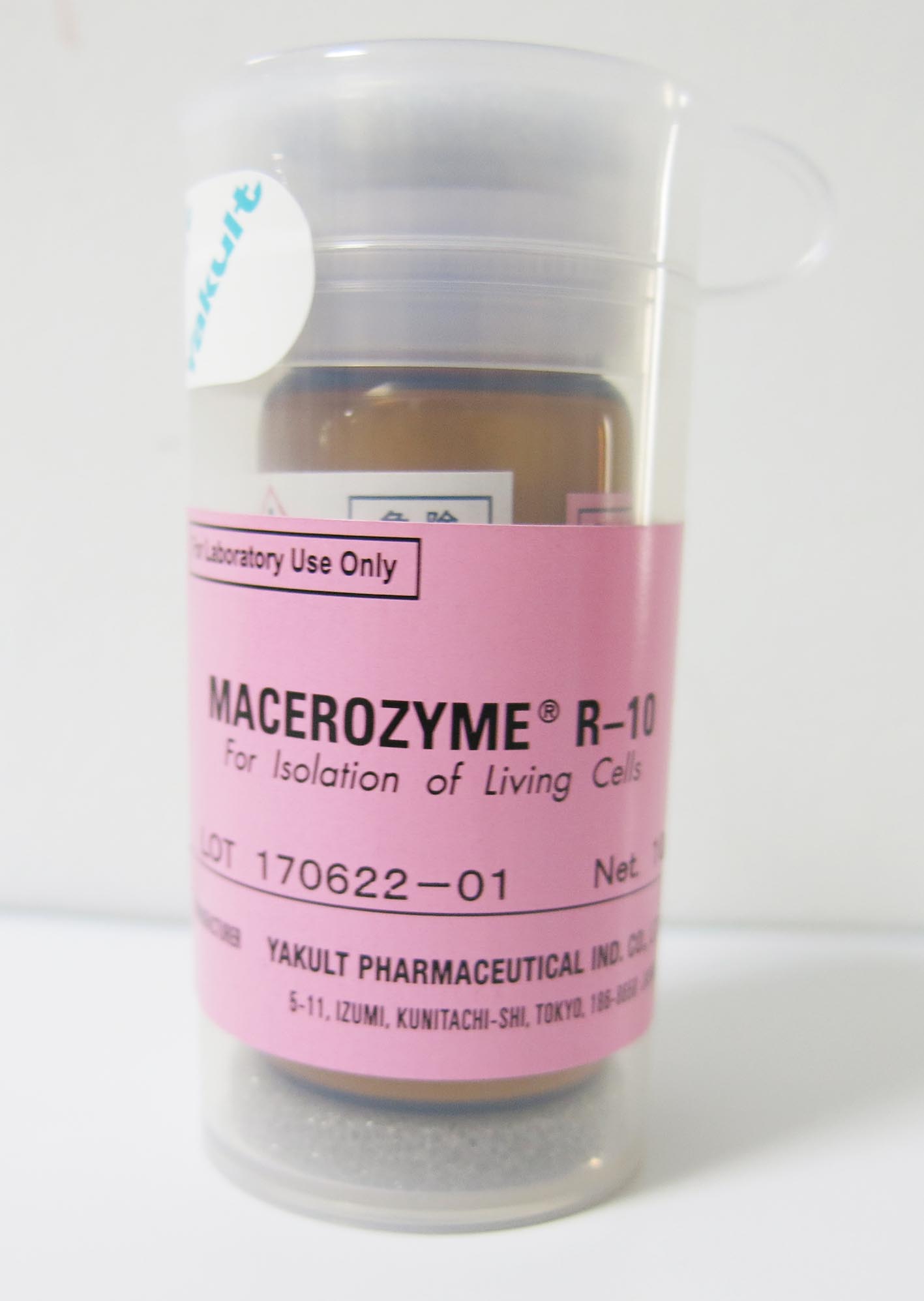 說明:Enzyme derived from Rhizopus sp. Possesses high pectinase and hemicellulase activity. Decomposes plant tissue to isolate single cells. It is often used in combination with cellulose “Onozuka R-10”.