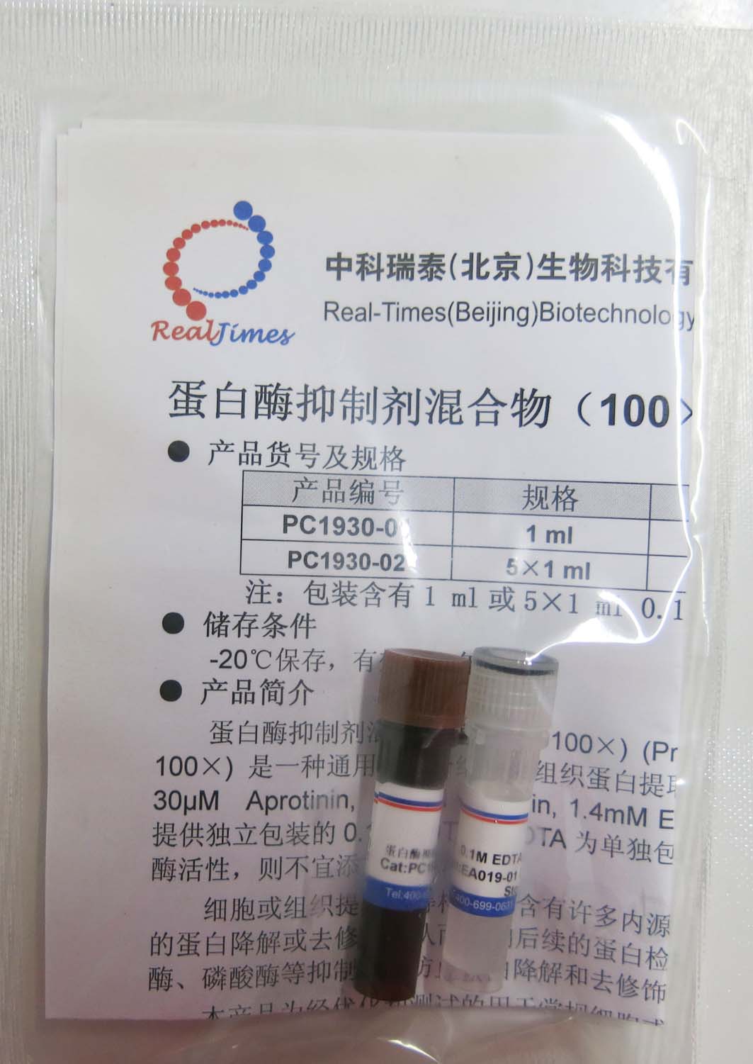 30μM Aprotinin, 1 mMBestatin,1.4mME64 and 1mMLeupeptin in DMSO),并提供獨(dú)立包裝的0.1MEDTA。EDTA為單獨(dú)包裝,以便選擇性使用。如用于檢測(cè)金屬蛋白酶活性,則不宜添加EDTA。
