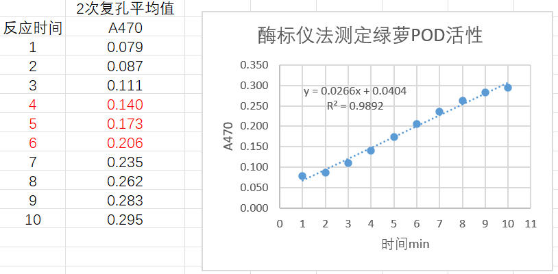 取0.5 克綠蘿葉片,加入5 ml提取液冰浴勻漿,制成10%勻漿液,12000 rpm 4℃離心10 min,取上清置于冰上,按照測定步驟操作,三個復孔,設定酶標儀檢測波長470 nm,間隔1 min采集數據,采集10次;時間對吸光值做線性回歸曲線,4-6 min線性較好,2 min內△A=0.225-0.130=0.095。
