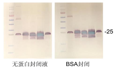 注意:使用本產品,PVDF膜和NC膜使用推薦封閉時間,經多種抗體的測試封閉效果顯著優于常規的BSA封閉1 h。對于一些背景非常高的抗體,可以嘗試延長封閉時間。如有特殊需要,也可4℃封閉過夜。