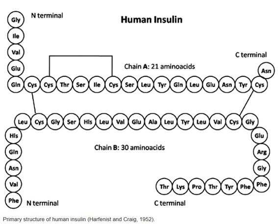 β)的多肽激素,是目前已知的機(jī)體內(nèi)唯一能夠降低血糖的蛋白激素,不僅可以調(diào)控細(xì)胞對葡萄糖、氨基酸和脂肪酸的攝入、利用和儲存,同時(shí)能促進(jìn)糖原、脂肪和蛋白質(zhì)的合成。它是一條由21個(gè)氨基酸組成的α鏈和另一條由30個(gè)氨基酸組成的β鏈,通過兩對二硫鍵連結(jié)而成的一個(gè)雙鏈分子,且α鏈本身還有一對二硫鍵,分子量約5800 Da。