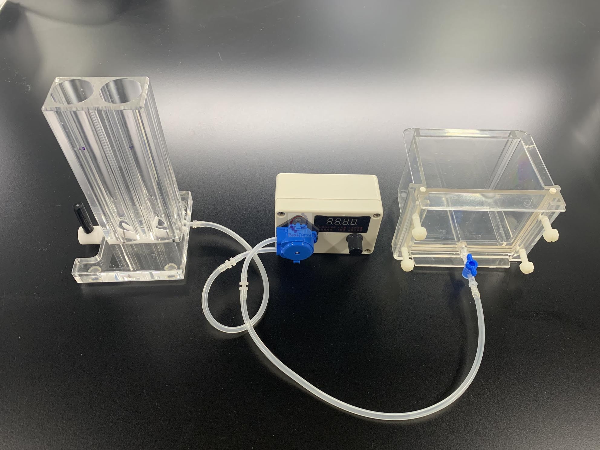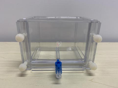 檢查無誤后,打開蠕動泵,使用a模式,調節數字為25,開始灌膠操作。至多板制膠器中的溶液至頂部接近溢出時,首先關閉多板制膠器藍色閥門(旋鈕與硅膠管垂直為關閉);