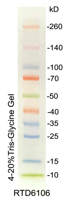 本產品包含10種純化的預染蛋白質組成,分子量范圍為10kD-260kD,含有四種不同顏色,可以用于SDS-PAGEWestern Blot轉膜時確定未知蛋白的分子量。
