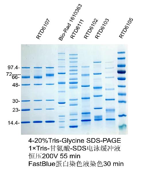 本產品包含6種已知分子量的標準蛋白質組成,分子量范圍為14.4-97.4 kD,可以用來判斷 SDS-PAGE未知蛋白的分子量。本產品為非預染蛋白Marker,電泳后需要染色后觀察條帶。