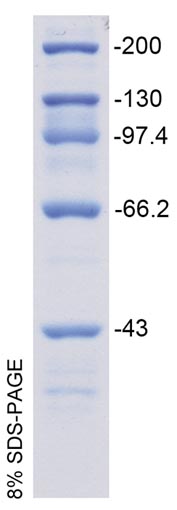 本產品包含5種蛋白質混合物,分子量范圍為43kD-200kD,經過SDS-PAGE電泳,用考馬斯亮藍染色后可以得到分布均勻密度相近的5條帶,可以用來判斷SDS-PAGE電泳后蛋白質的分子量。