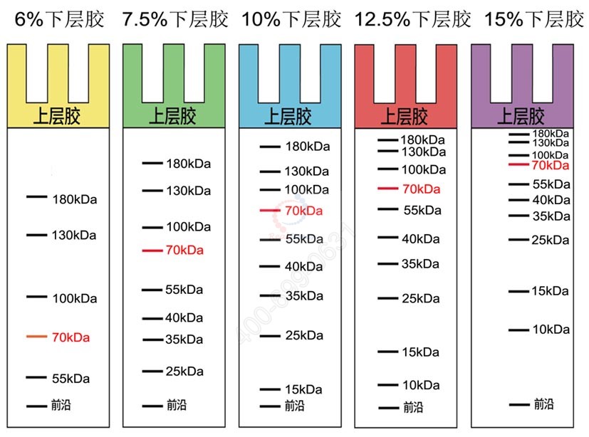 上圖為 Tris-甘氨酸緩沖系統中,蛋白分子量標準 (10-180 kDa,含有 10 條蛋白條帶 ) 在不同濃度的 SDS-PAGE凝膠中的分離示意圖。因溫度、pH 值等因素不同,實際分離情況會略有出入,本圖僅供參考。