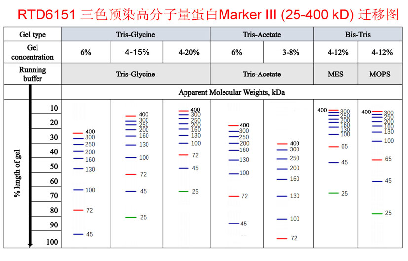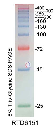 本產品包含10種純化的預染蛋白質組成,分子量范圍為25-400 kD (25, 45, 72, 100, 130, 160200250, 300 kD),其中400 kD為暗紅色,72 kD條帶為橙紅色,25 kD為綠色,其余條帶為藍色,可以用于SDS-PAGEWestern Blot轉膜時確定未知蛋白的分子量。