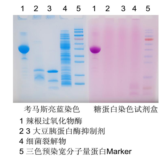 本產品用于PAGE 凝膠或蛋白免疫印記硝酸纖維素膜上糖蛋白的檢測。整個染色2.5小時完成。染色后的糖蛋白為品紅色條帶,背景為淺粉色或者無色。該試劑盒檢測的靈敏度一般可以達到微克級別,但實際靈敏度跟靶蛋白糖基化程度相關,可以用于 SDS-PAGE 和2D電泳的凝膠檢測,也可以用于瓊脂糖凝膠電泳的檢測(但背景較高),還可以用于硝酸纖維素印跡膜的檢測。