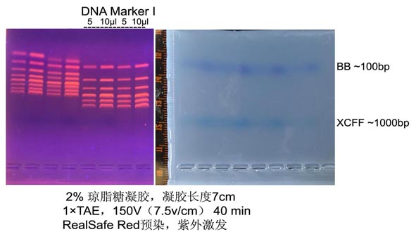 4. 推薦使用RealSafe系列染料(貨號:GR002,GR003,GR004)染色。如果使用Goldview或EB等染料進行染色,由于此類染料帶更多的正電荷(染料移動方向與核酸泳動方向相反),隨著電泳時間延長,染料向大片段聚集,凝膠會出現陰陽膠現象(染料含量高的凝膠紫外下較亮,含量低的凝膠紫外下發暗),導致小分子量DNA顯色很弱或不可見。陰陽膠可以在電泳結束后浸泡染色,將膠浸沒在含1 μg /ml EB或Goldview的電泳緩沖液中20-25 min,小分子量DNA會顯色清楚。更長時間浸泡會因DNA分子擴散而使條帶彌散,小分子量DNA更易彌散。