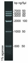 本產品是由6條精準定量的帶狀雙鏈DNA條帶組成,適用于瓊脂糖凝膠電泳中DNA條帶的定量分析。產品中已含有1×loading buffer,可根據實驗需要,直接取2-5μl電泳,使用方便,電泳圖像清晰。6條帶的大小分別為500bp,1000bp,1500bp,3000bp5000bp,8000bp,其中3000bp條帶最亮,含量為100ng/5μl,其余條帶濃度為50ng/5μl。