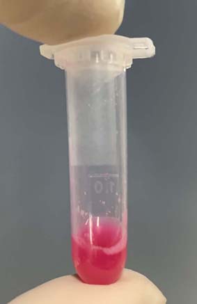2. 向菌體沉淀的離心管中加入250 μl溶液P1(請先檢查是否已加入RNaseA)和5μl Lysis Dye,使用移液器或渦旋振蕩器徹底懸浮細菌細胞沉淀,此時溶液為渾濁的紅色。