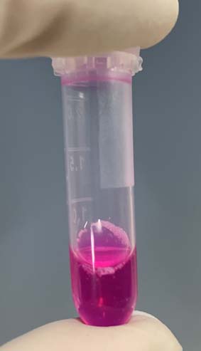 2.   向菌體沉淀的離心管中加入250 μl溶液P1請先檢查是否已加入RNaseA)和5μl Lysis Dye,使用移液器或渦旋振蕩器徹底懸浮細菌細胞沉淀,此時溶液為渾濁的紅色。