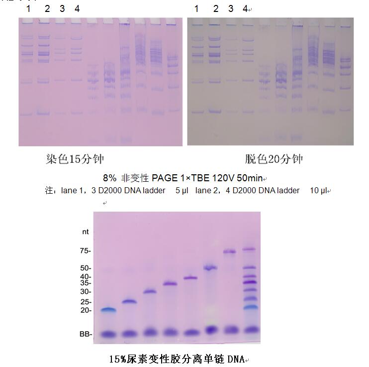 核酸PAGE電泳染色試劑盒(PAGE Stain Kit for Nucleic Acids)是一種快速簡單、可用于聚丙烯酰胺凝膠中的核酸檢測的試劑盒。采用新型染色劑,電泳結束后可以直接染色凝膠,不用借助任何成像儀器,既能觀察核酸條帶。該方法能檢測到下限10ng的 DNA條帶,常用于檢測 SSR 標記、SNP 標記等。
