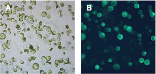 注:酶解時間與葉片種類,葉片生長狀態有關,請根據實驗需要適當調整酶解時間。3小時為擬南芥葉片推薦的酶解時間。如條件允許,可以使用微型真空泵常溫避光條件下抽真空30 min,以使酶溶液更好地進入細胞間隙。酶溶液變為綠色表明有原生質體已經有分離,溶液為濃綠色表明原生質體已經大量分離。擬南芥原生質體大小約為30-50 μm,顯微鏡鏡檢后確定是否分離。葉片原生質體細胞顯微鏡下為綠色圓球狀,葉綠體分散在整個細胞內,說明狀態較好;如呈現不規則形狀,說明原生質