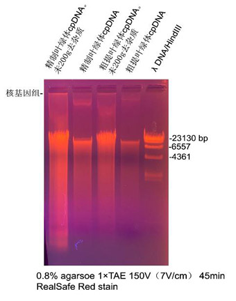 μl洗脫,上樣5 μl,電泳結(jié)果見下圖左二泳道,cpDAN大小約20kb,無可見核基因組污染。